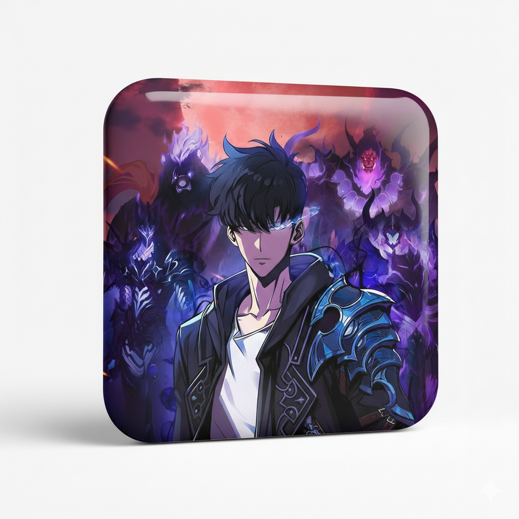 Invoque o poder do Monarca das Sombras com este botton exclusivo de Solo Leveling. A arte captura a imponência de Sung Jin-Woo, o caçador que se reergueu do nível mais baixo para se tornar uma lenda, acompanhado por seu exército de sombras leais.