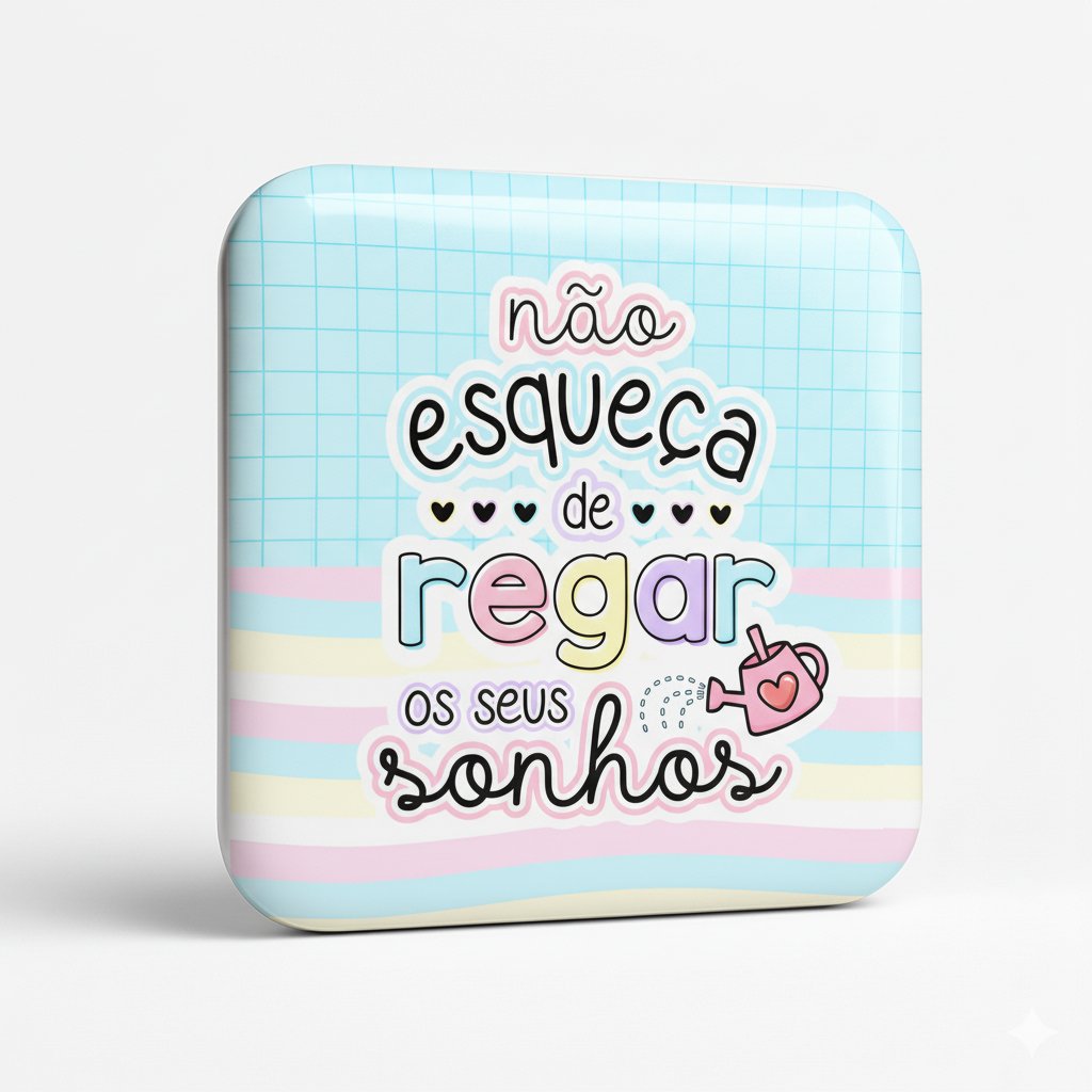 Um lembrete diário, delicado e carinhoso para nunca desistir daquilo que faz seu coração vibrar. Este botton, com sua estética colorida e a mensagem "Não esqueça de regar os seus sonhos", é como um abraço na alma. Perfeito para decorar seu espaço de trabalho, seu cantinho de estudos ou qualquer lugar que precise de um toque de inspiração. Ele te lembra de cultivar seus objetivos com amor, paciência e dedicação todos os dias.