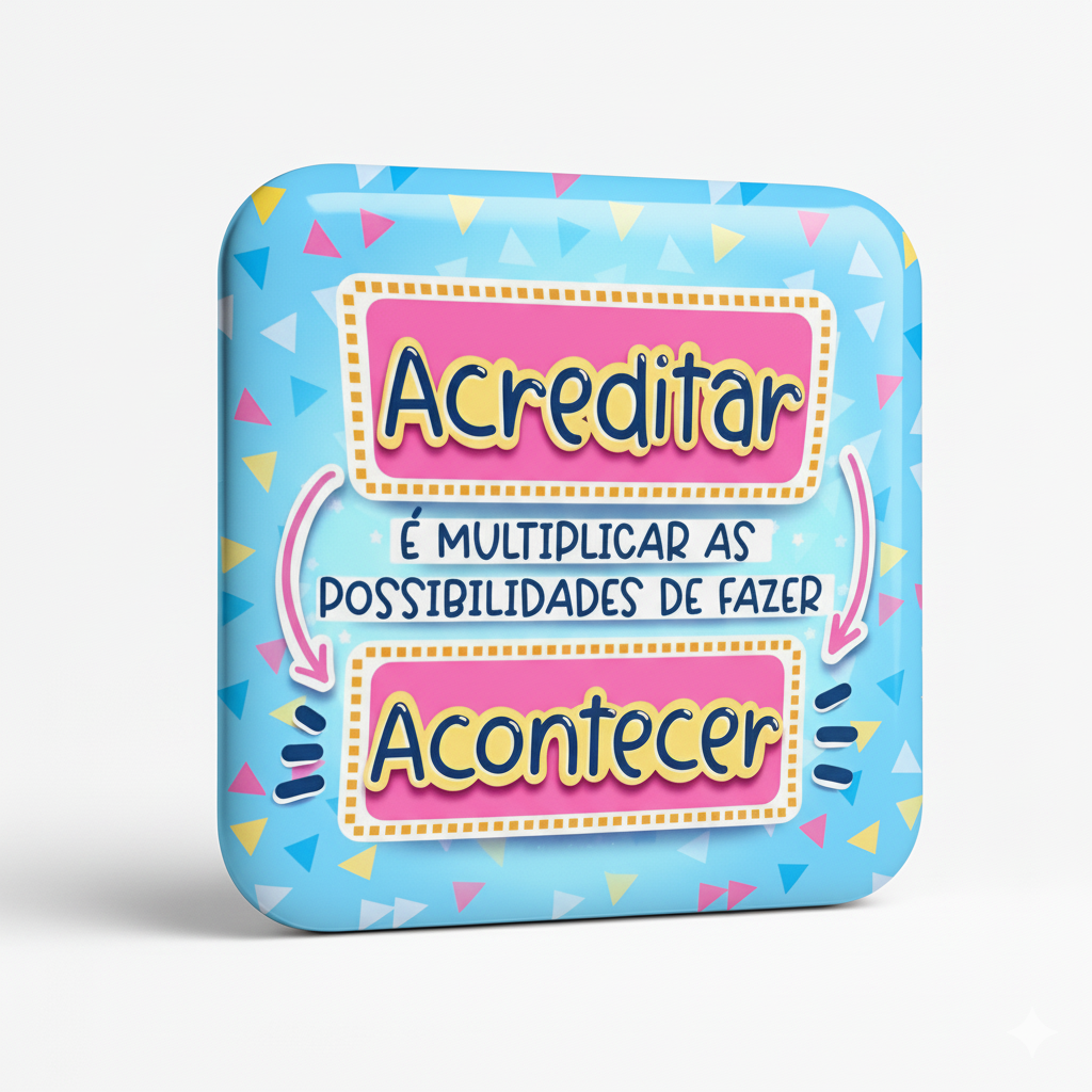Dê um gás na sua motivação! Este botton com design vibrante e cheio de energia traz uma mensagem poderosa: "Acreditar é multiplicar as possibilidades de fazer acontecer". É a peça perfeita para quem está focado em seus objetivos e sabe que a confiança é o primeiro passo para a conquista. Use-o como um amuleto diário para lembrar que você é capaz de transformar seus sonhos em realidade.