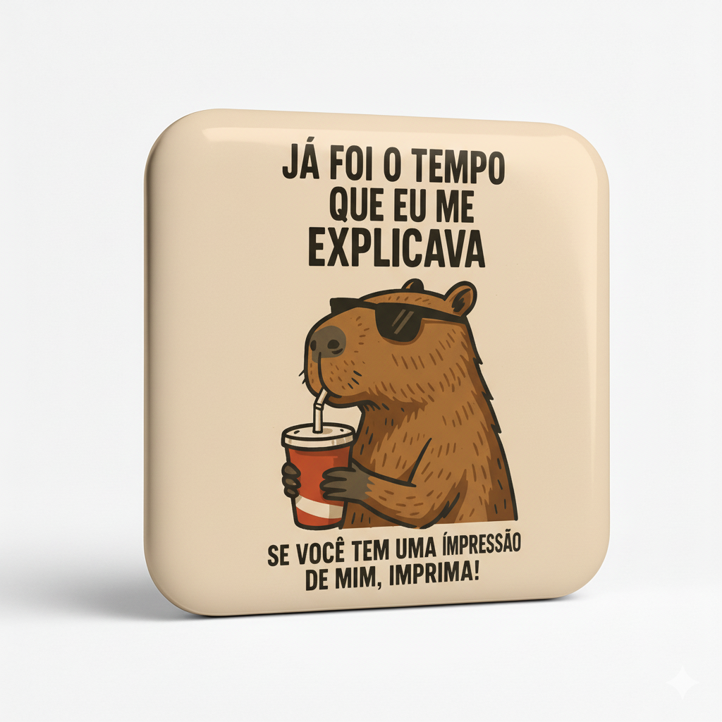Para quem já cansou de dar satisfação, este botton é o recado perfeito! Estrelando a capivara mais descolada do pedaço, ele carrega a frase: "Já foi o tempo que eu me explicava. Se você tem uma impressão de mim, imprima!". É a peça ideal para quem leva a vida com bom humor e uma dose saudável de deboche. Perfeito para decorar seu espaço e arrancar risadas.
