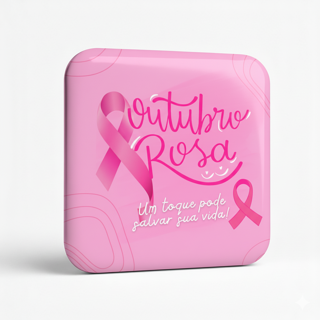 Um toque pode mudar tudo. Este botton do Outubro Rosa carrega uma das mensagens mais fortes da campanha: "Um toque pode salvar sua vida!". Ele é um lembrete impactante sobre a importância do autoexame e do diagnóstico precoce.