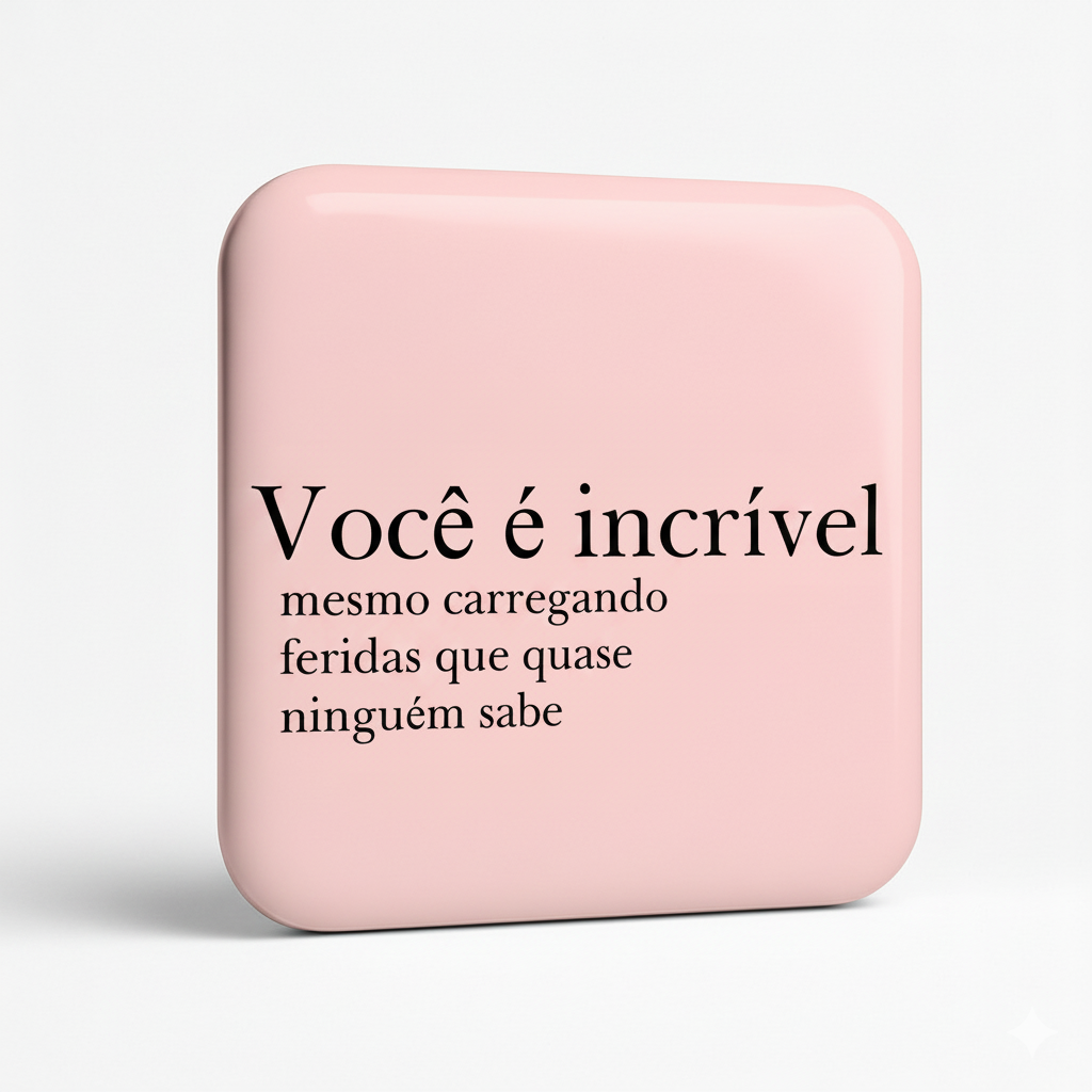 Um lembrete diário e gentil de que sua força vai muito além do que os outros conseguem ver. Este botton, com seu design delicado e mensagem poderosa, foi criado para celebrar a sua resiliência. A frase "Você é incrível mesmo carregando feridas que quase ninguém sabe" é como um abraço em forma de acessório.